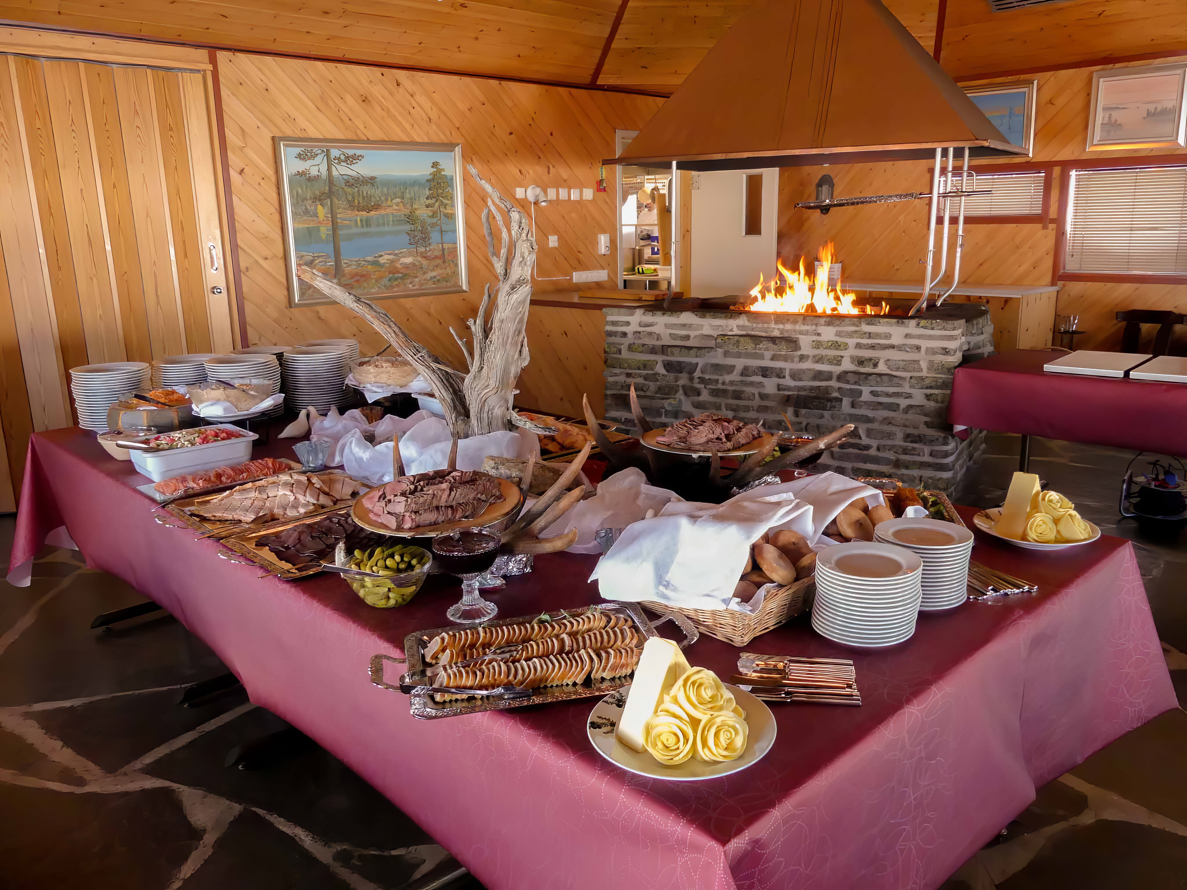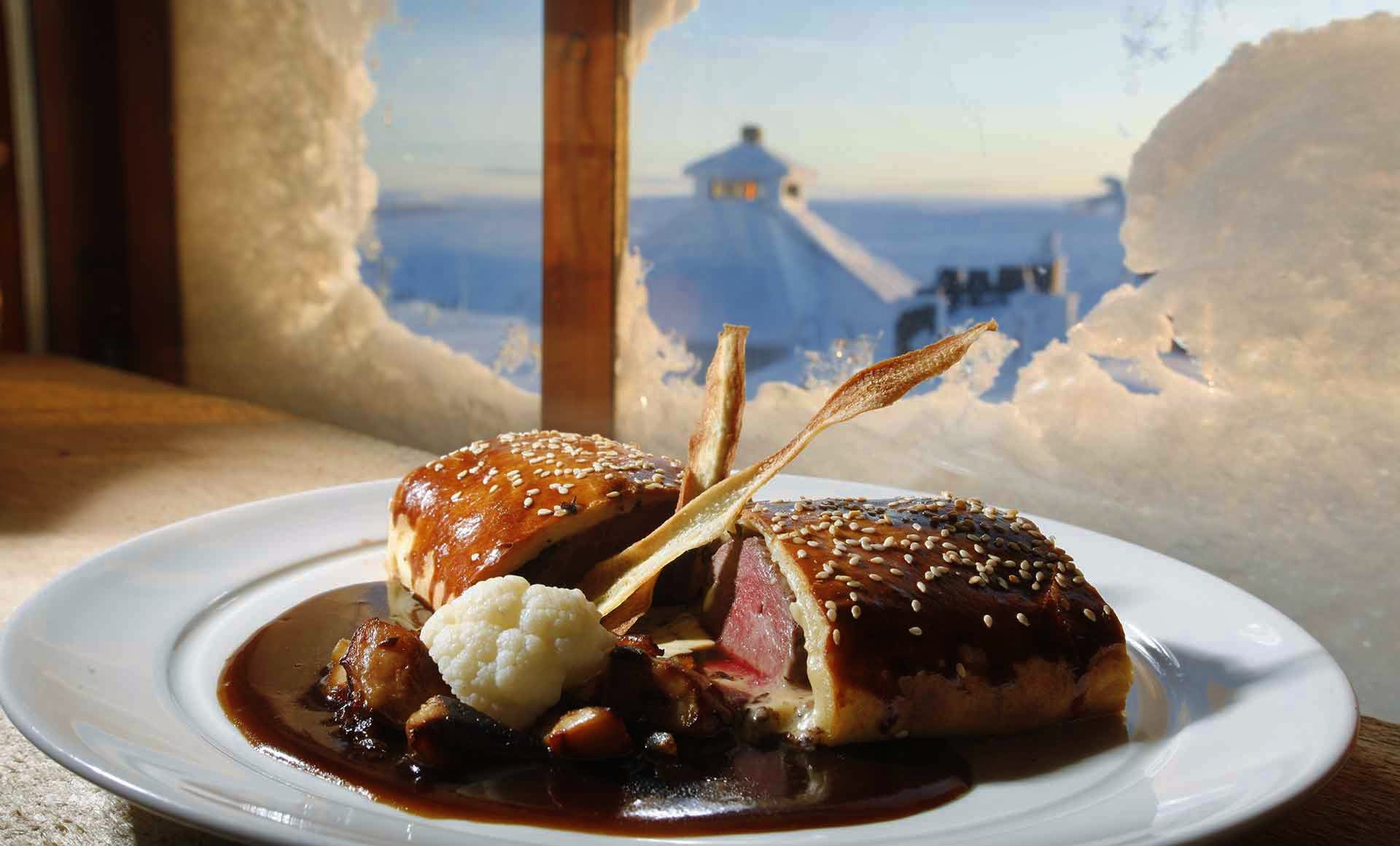 | Huipun leike - savuporolla ja leipäjuustolla täytetty häränleike - savuporo-kermakastiketta - lohkoperunoita ja kasviksia |